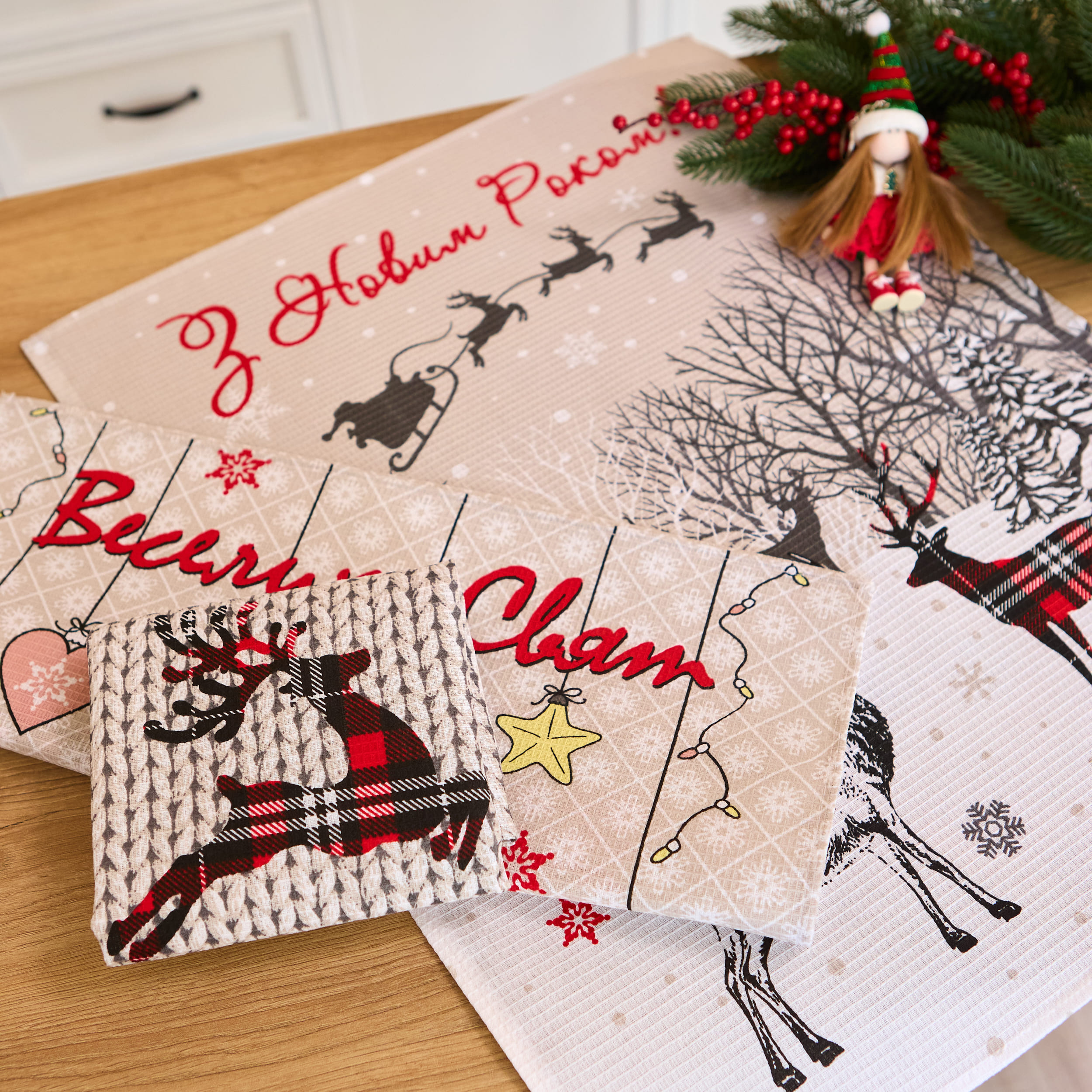 Набір рушників вафельних "Щасливого Різдва" 60 х 47 см - м’які та зносостійкі (комплект 3 шт)